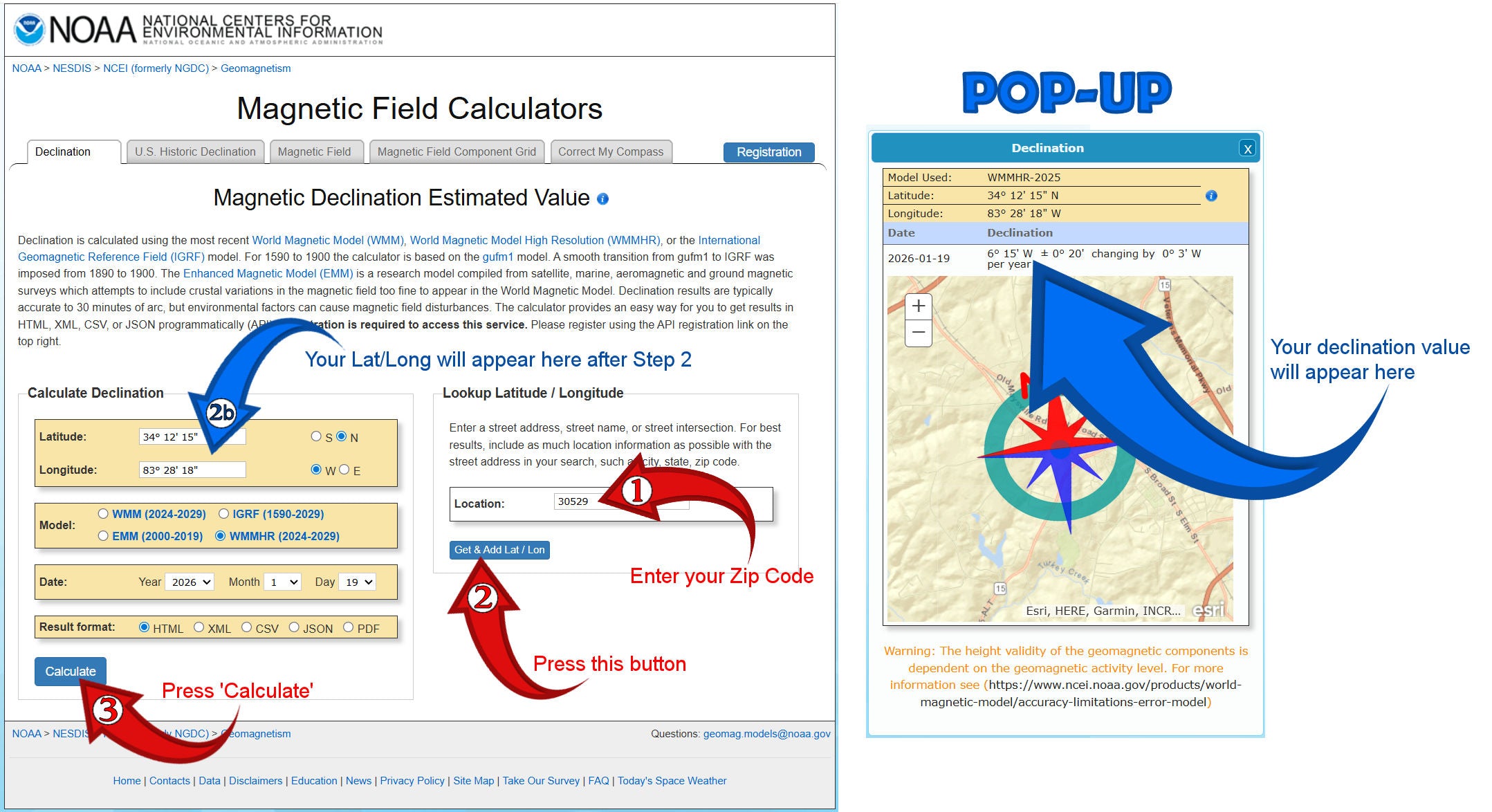 STEP 1 will be to enter your zip code. Then STEP 2 will be to press the 'Get & Add Lat/Long' button. This will auto-populate your Latitude and Longitude on the left side (as shown in 2b below). Now, your final STEP 3 will be to press the blue 'Calculate' button on the lower left. This will bring a pop-up with your Declination amount in degrees and minutes.